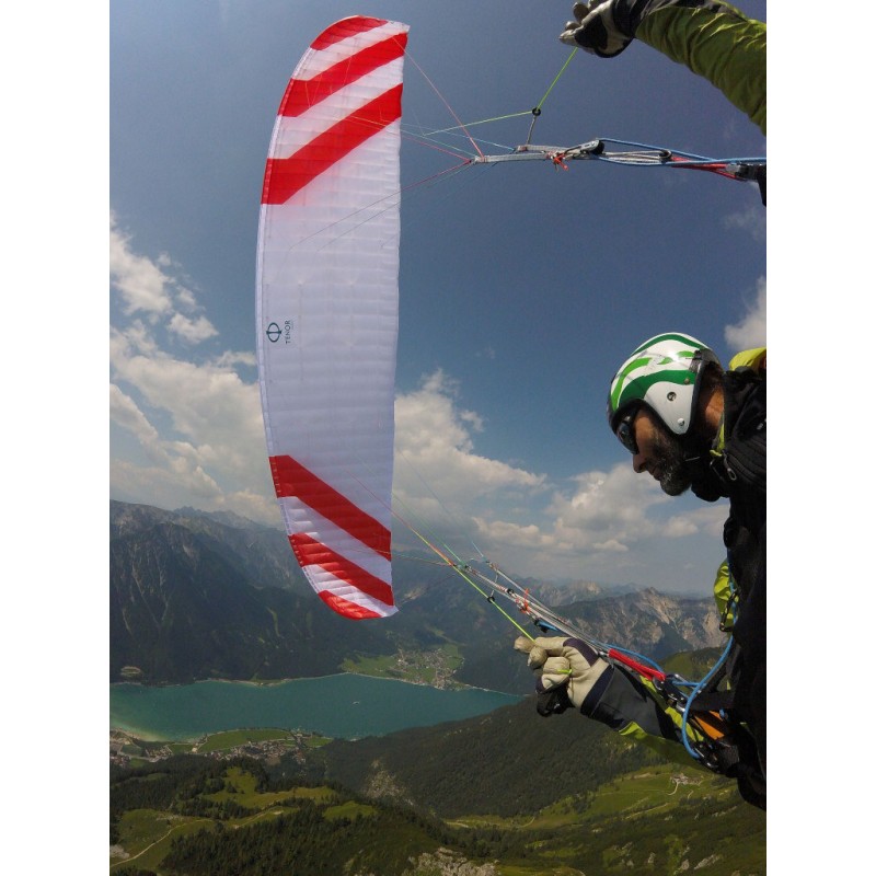 The weight reduction of the TENOR light over the normal TENOR is offering even better recovering after deflations and even less dynamic reactions in extreme manoeuvres. So it was possible to rise the max take off weight by 10kg. This has to be seen as an extended weight range, for pilots who want to fly a high loaded, small, light and very agile wing, offering extreme fun and performance at speed.